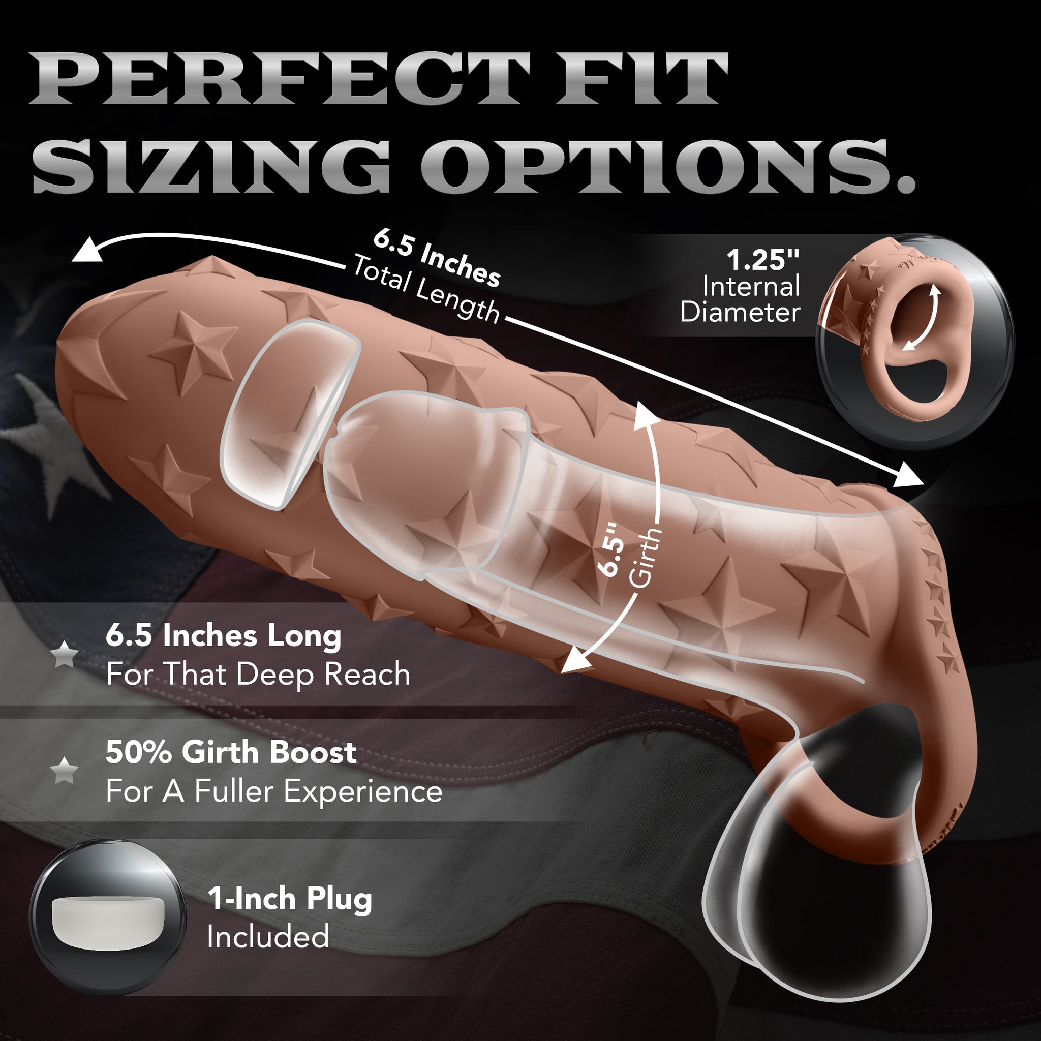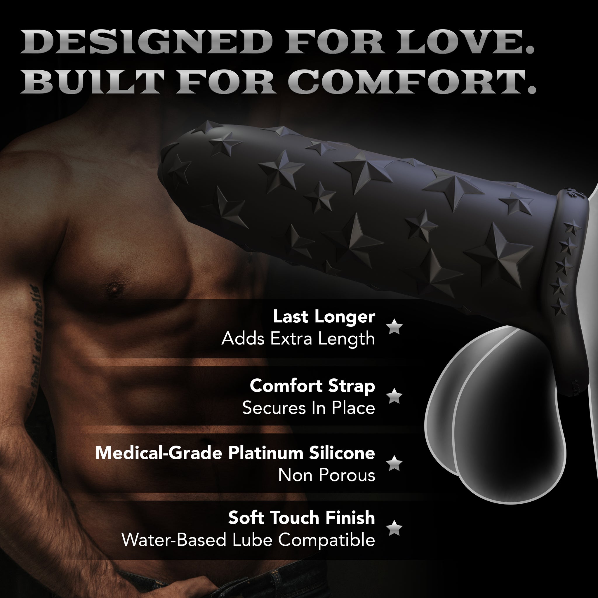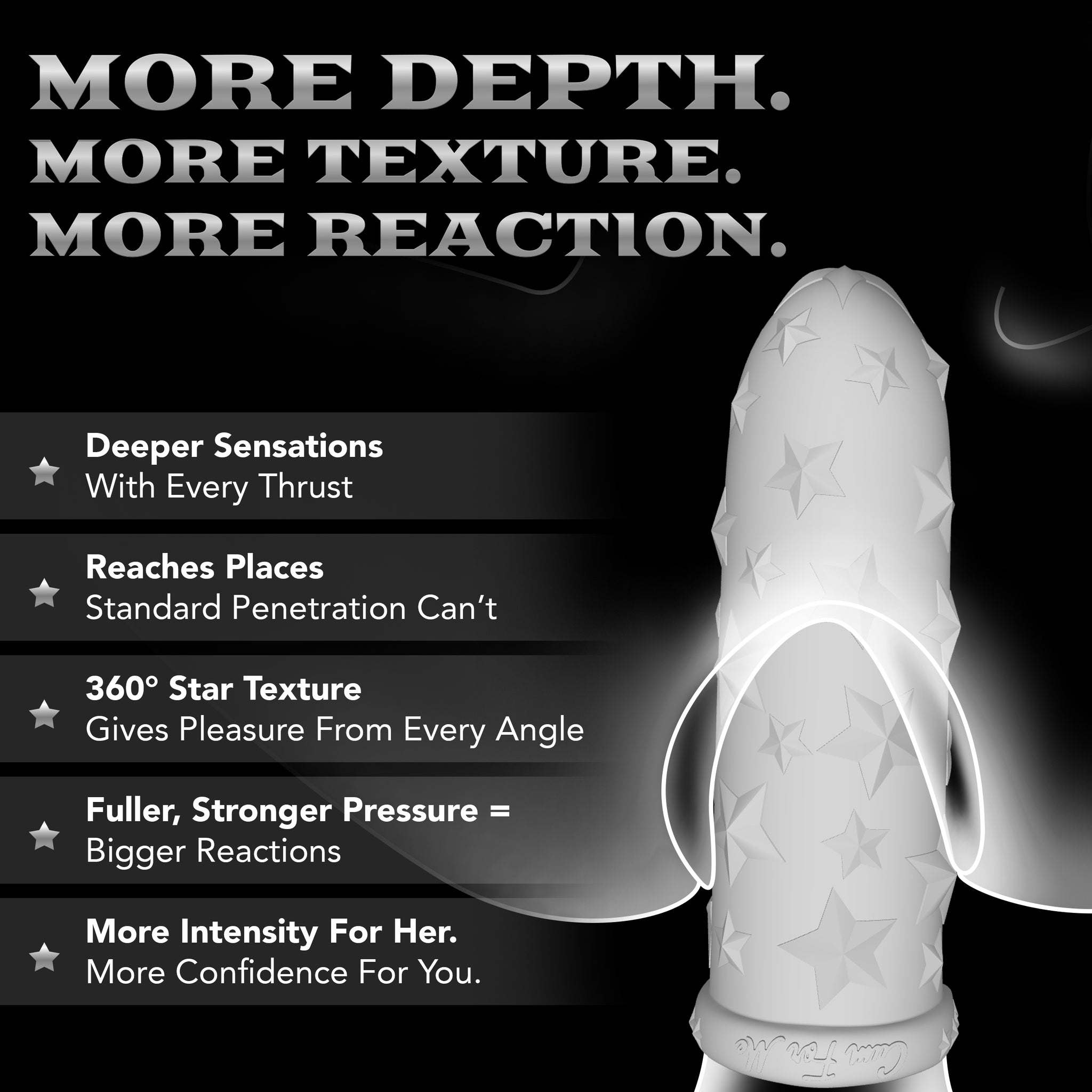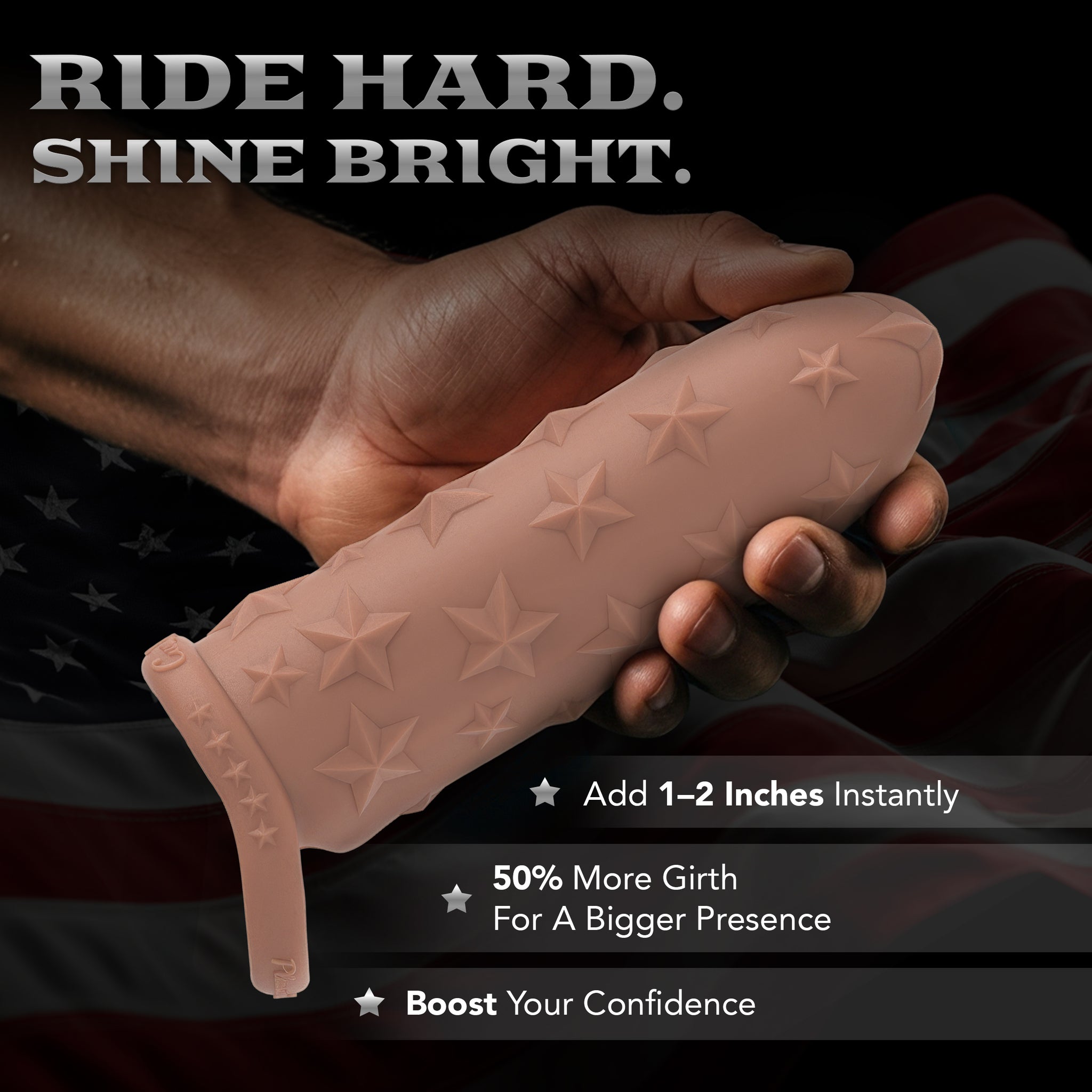 Experience the ultimate combination of added size and textured stimulation with our newest 50 Star-Studded Pleasure Extender. Designed to add up to 2” of length and 50% more girth, this extender showcases 50 raised stars, representing the 50 states of America, for a bold look and an unforgettable feel. Crafted from silky-soft, premium Platinum Silicone, the textured stars create a unique “rough rider” sensation while maintaining a smooth, comfortable glide.